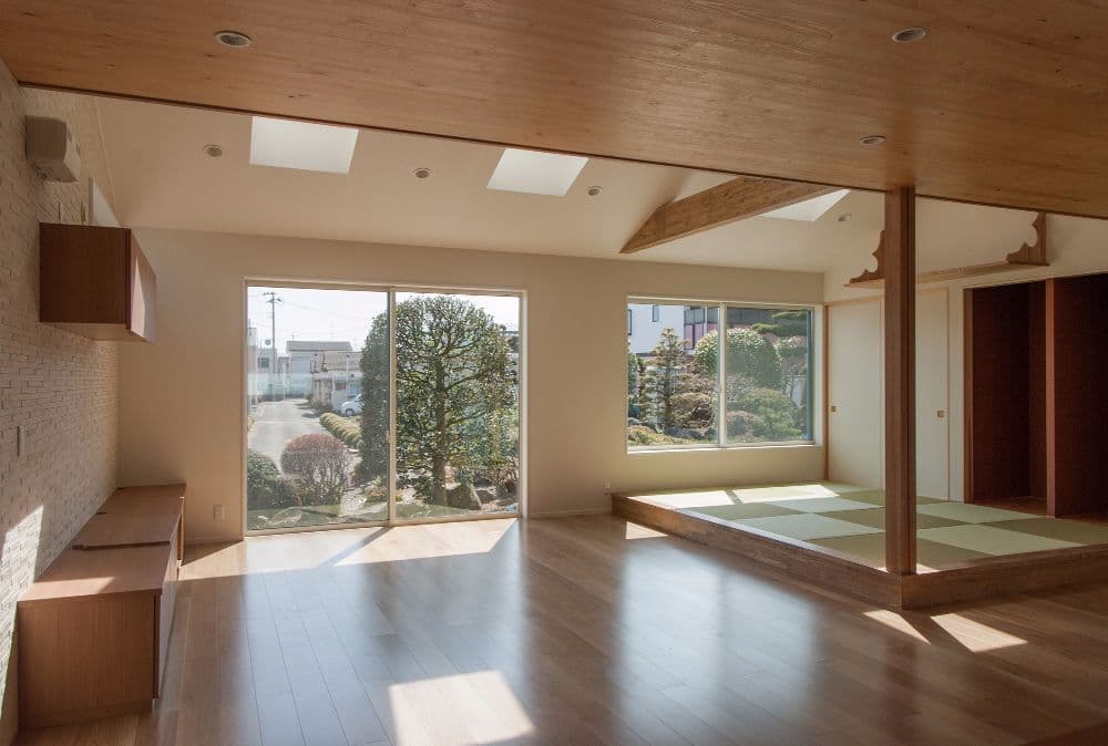 住宅の基本的な機能である玄関やLDK、サニタリーを共有する最大のメリットは、単に無駄がないというだけでなく動線が単純で将来の家族構成の変化にも柔軟に対応出来るところにあります。本計画は二世帯で5LDKとなっていますが、いずれは子供たちも所帯を持って三世帯となることも想定し、ひとつひとつに余裕を持たせた計画となっています。また、来客も多いので1階のLDK+タタミコーナーは36.5帖となっています。