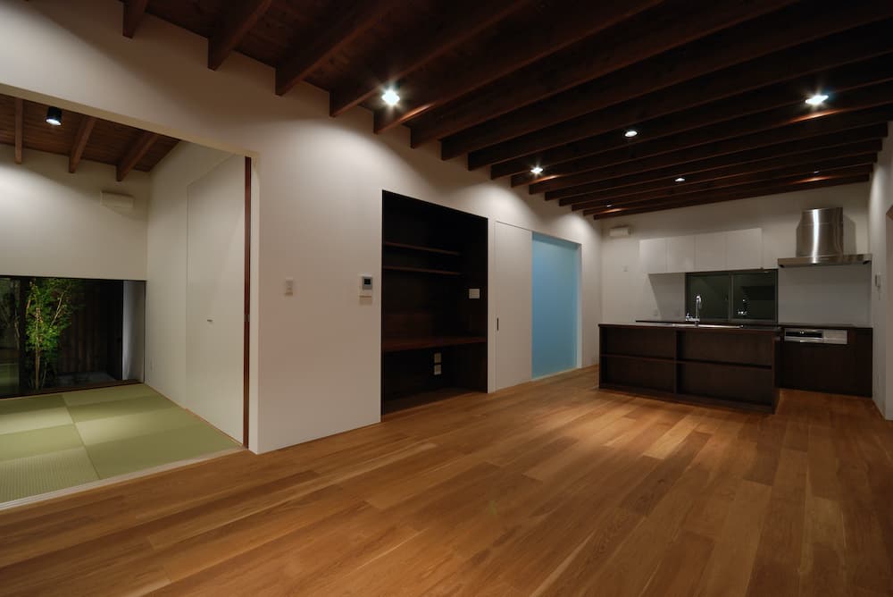 東西南北全てに窓を設けたリビングからは、爽やかな風とともに、四季折々の庭木を楽しむことが出来ます。仕上材や造作家具の素材にもこだわり、上質な空気感を追求しています。