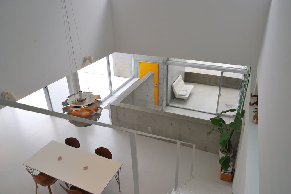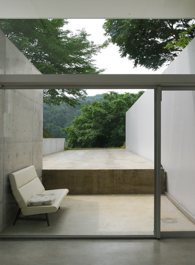 第2のリビングとでも言うべきゲストルームは、半地下部分に埋め込まれており、連続する外部空間も同様に半地下に掘り下げることで、溢れる緑以外余計なものは一切排除された、非日常的な空間となっています。