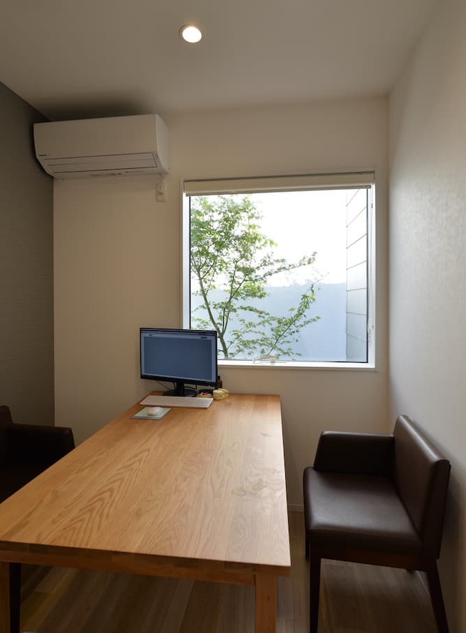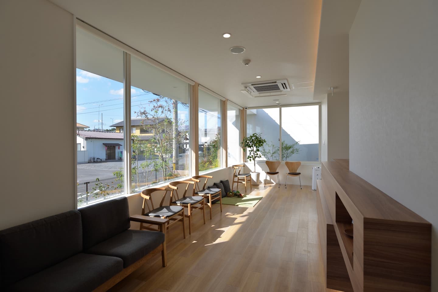 とは言え、あまり開放的すぎて外から丸見えでは来院者のプライバシーを守れませんので、いかに外からの視線をコントロールするかが本計画の鍵となります。そこで、道路との距離感や窓の位置、中庭を配置するなどして、院内どこにいても季節感のある植栽を眺められるように計画しました。