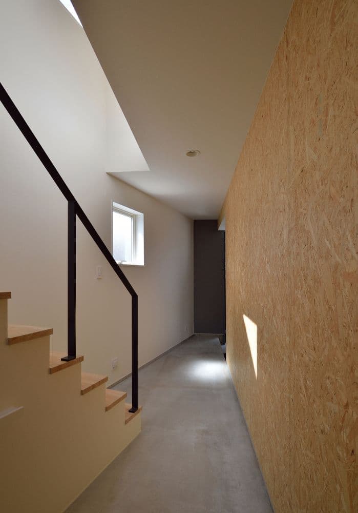 くさび形の変形狭小敷地に建つ、延べ床約30坪の狭小住宅です。