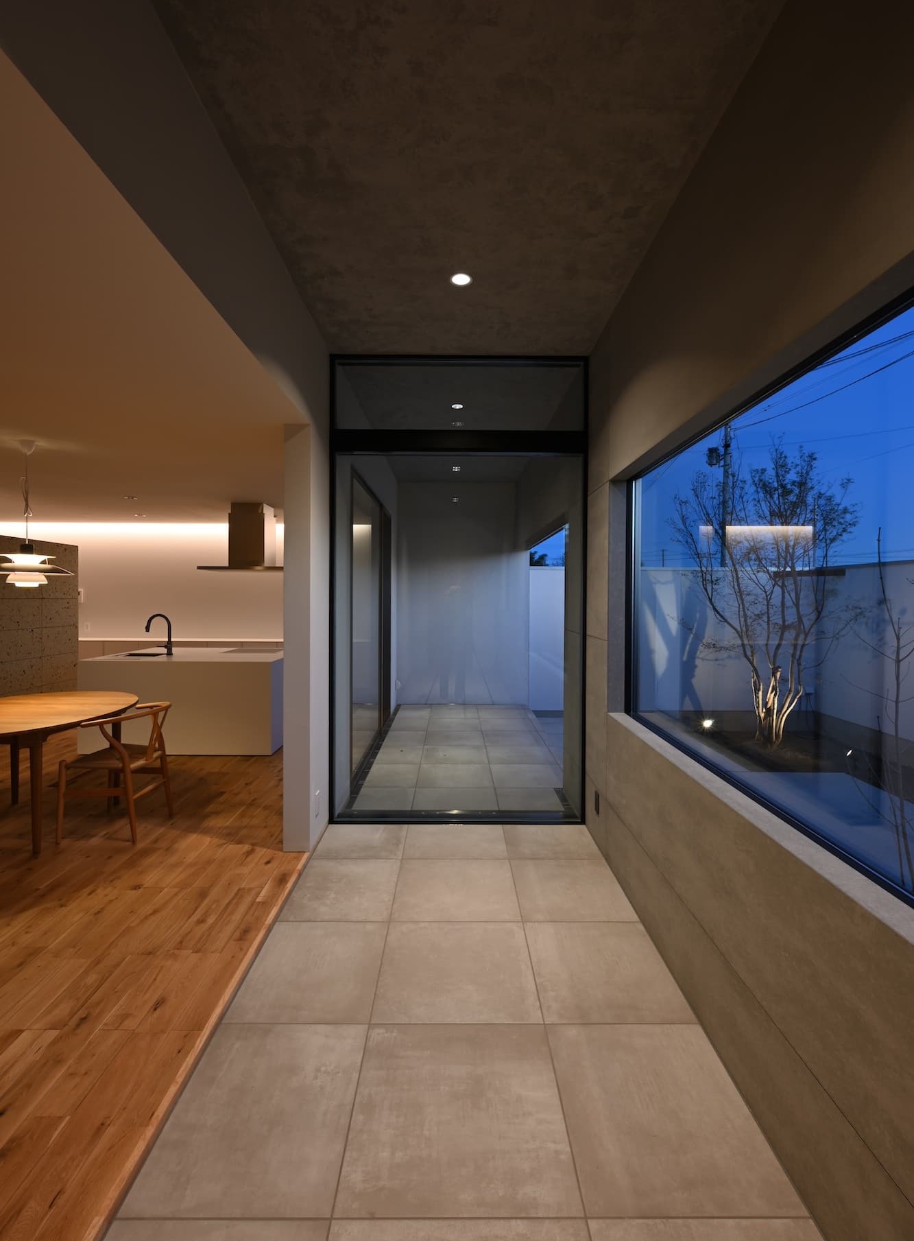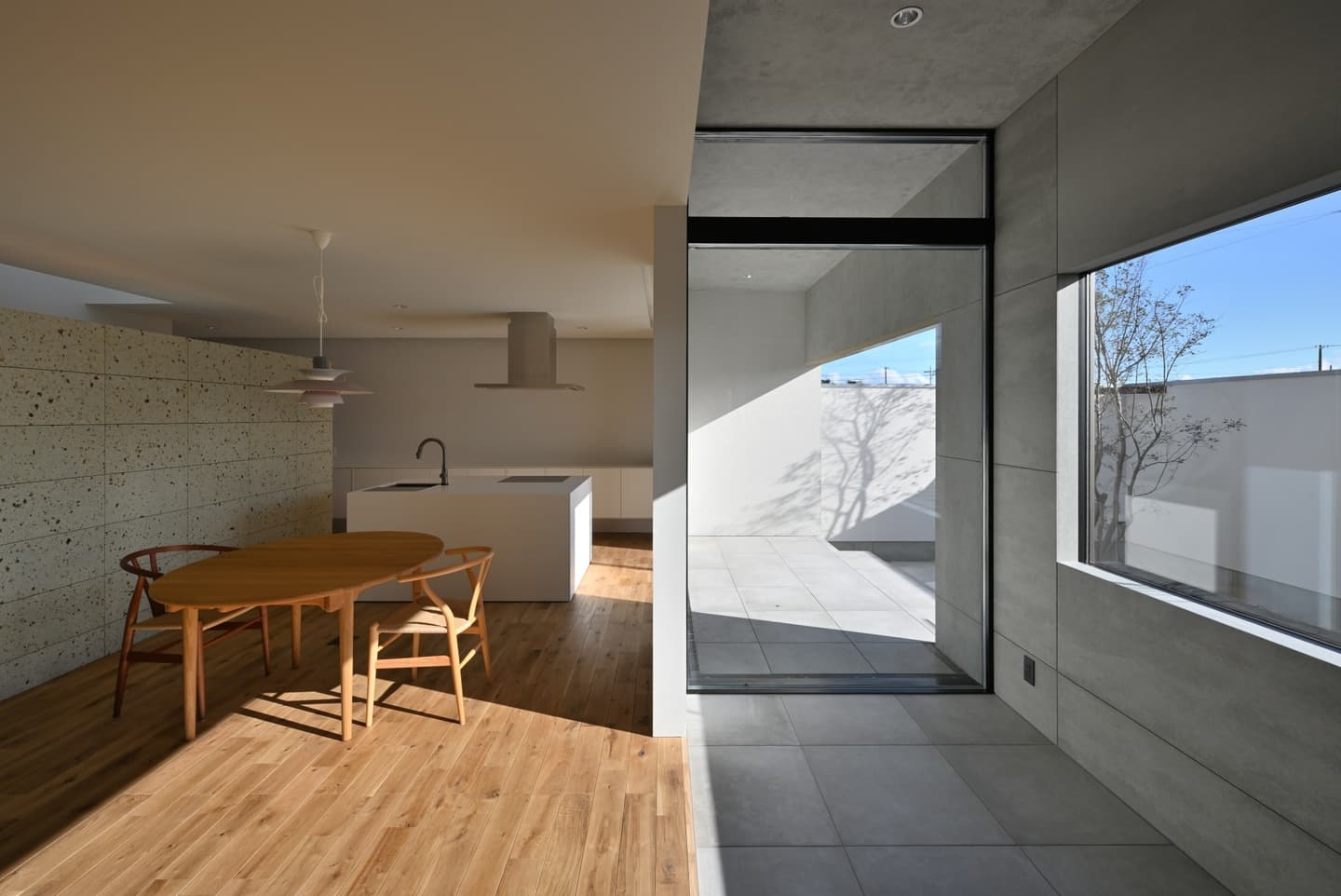 本計画は、外と内の関係性を層ごとに変化させて様々なシーンに柔軟に対応できる平屋住宅で、土間やテラスの層を庭とLDKの間に挿入して緩衝帯とすることで、季節や時間帯に応じて生活の重心を移せるようになっています。