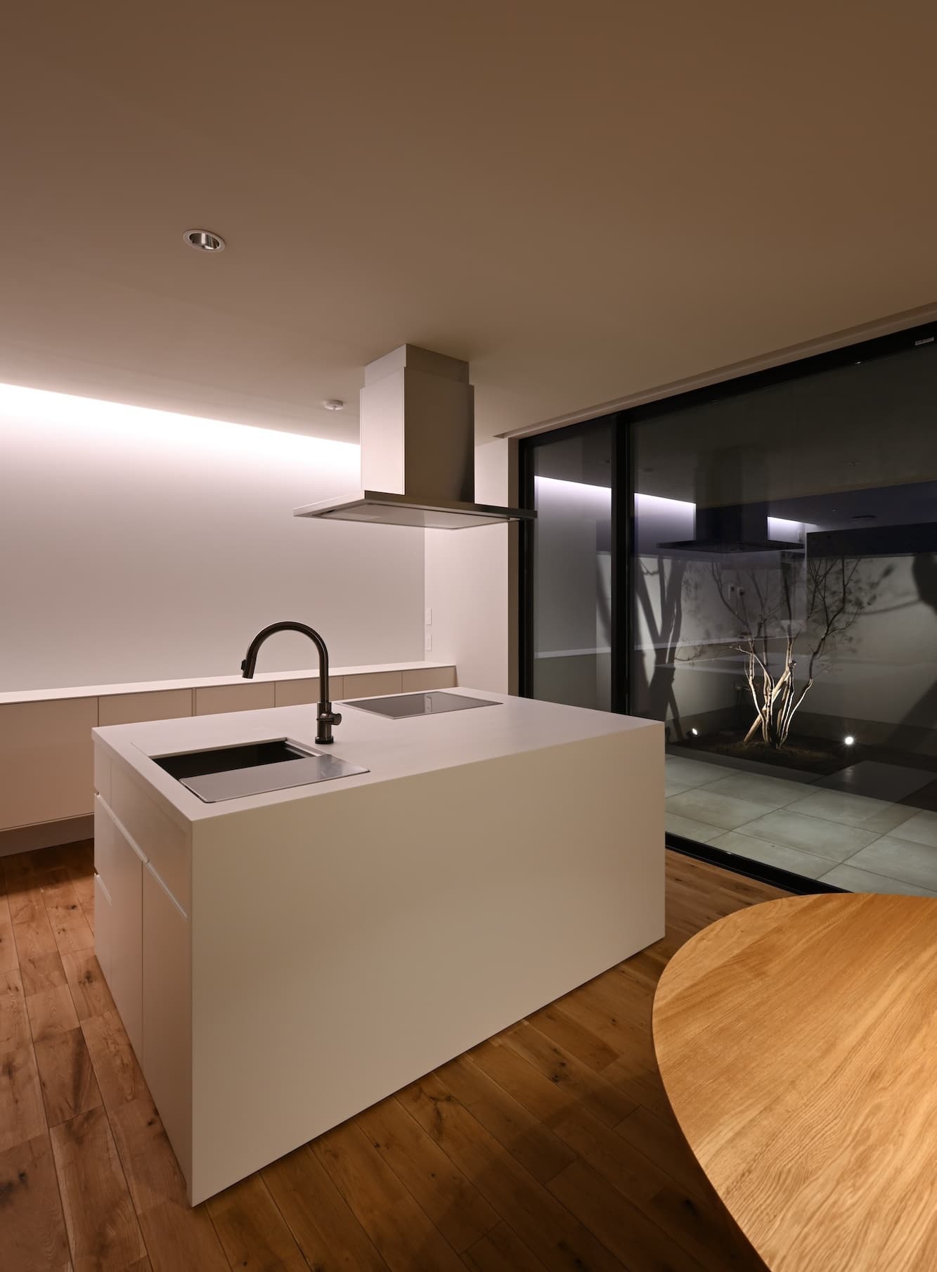 また、その奥には天窓から空が見える洗面コーナー、一番奥に寝室を配置し、徐々にプライバシー度が高くなっていき、家事動線と生活動線の効率化を図りつつ、プライバシーと開放性を両立させた住まいとなっています。
