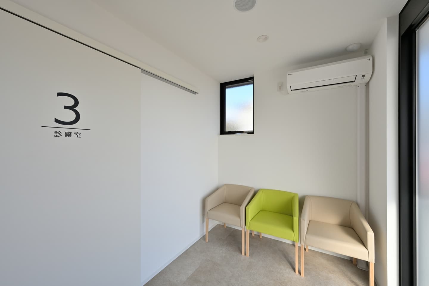 受付の前を通ると一般の待合があり、右脇を通ると発熱外来用の待合室があります。発熱外来の待合室は外から直接入ることも出来るので、一般動線と完全に区画することが可能なようになっています。