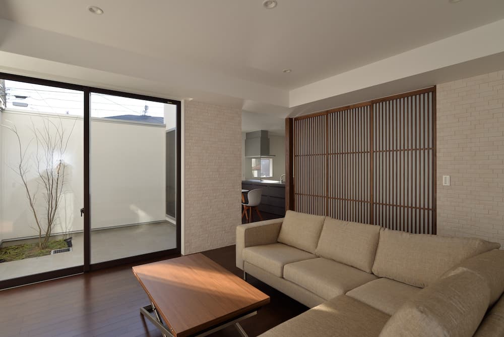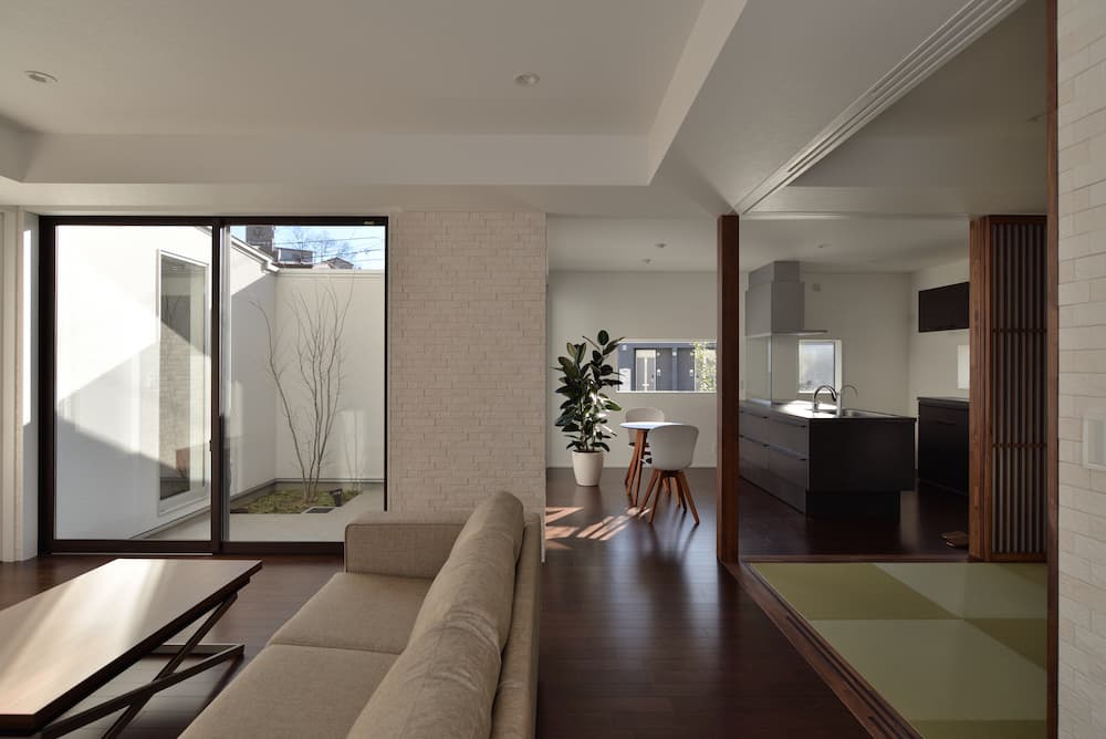 1階は中庭とリビング、ダイニングの一体感だけでなく、外から見られないという安心感も開放感につながっています。