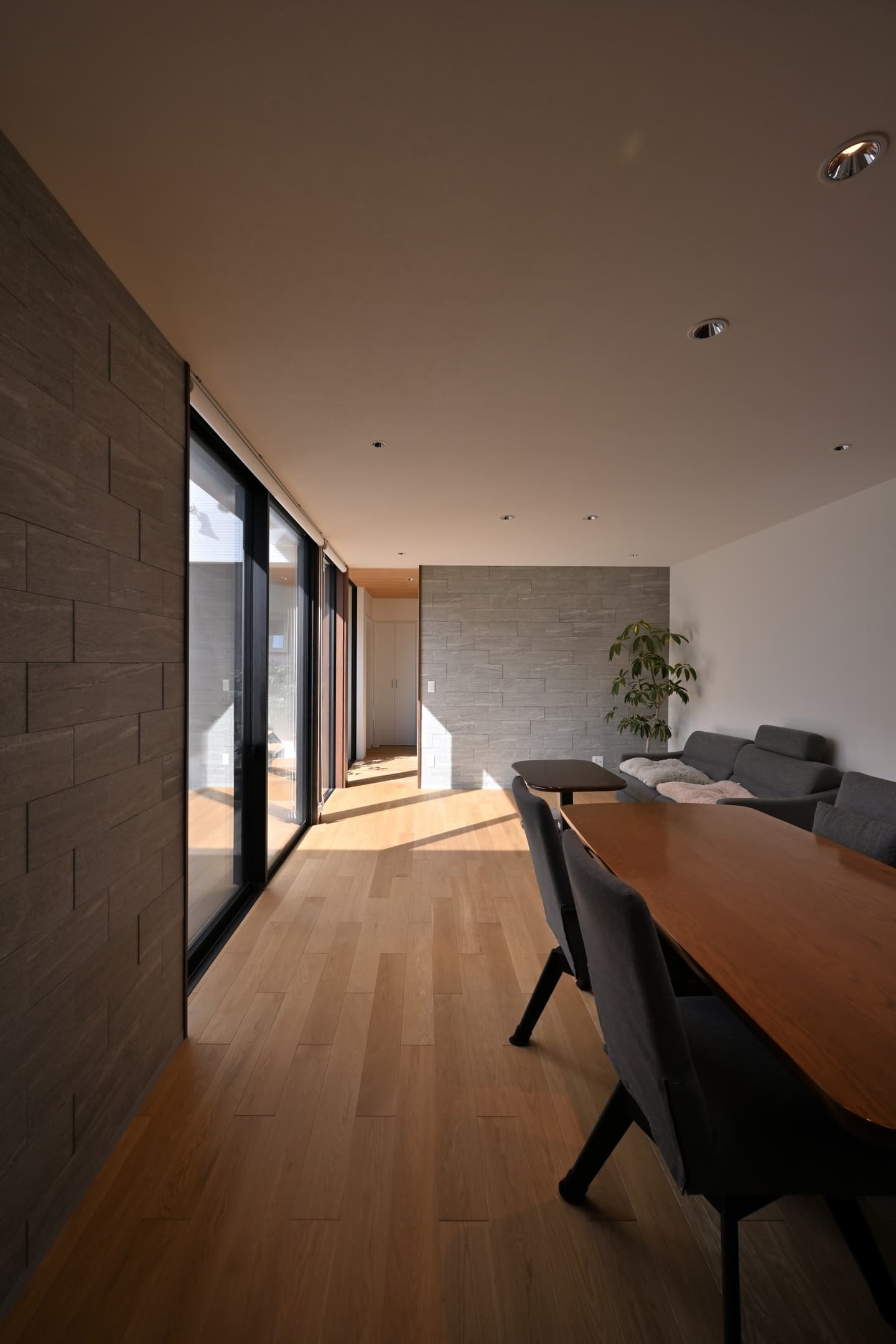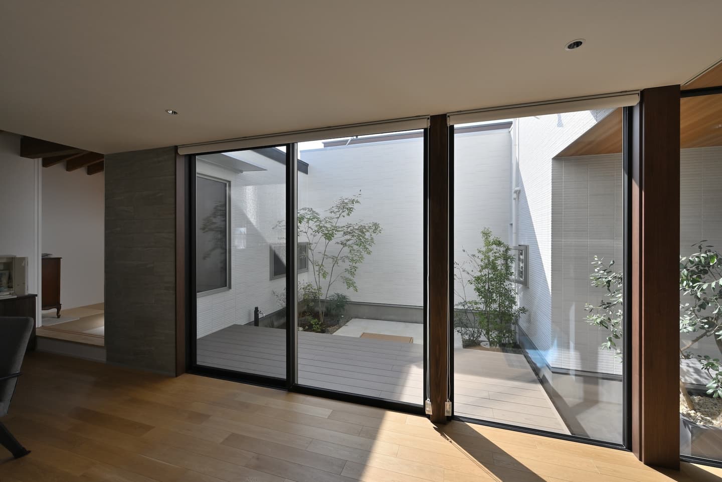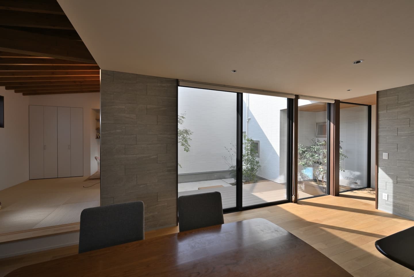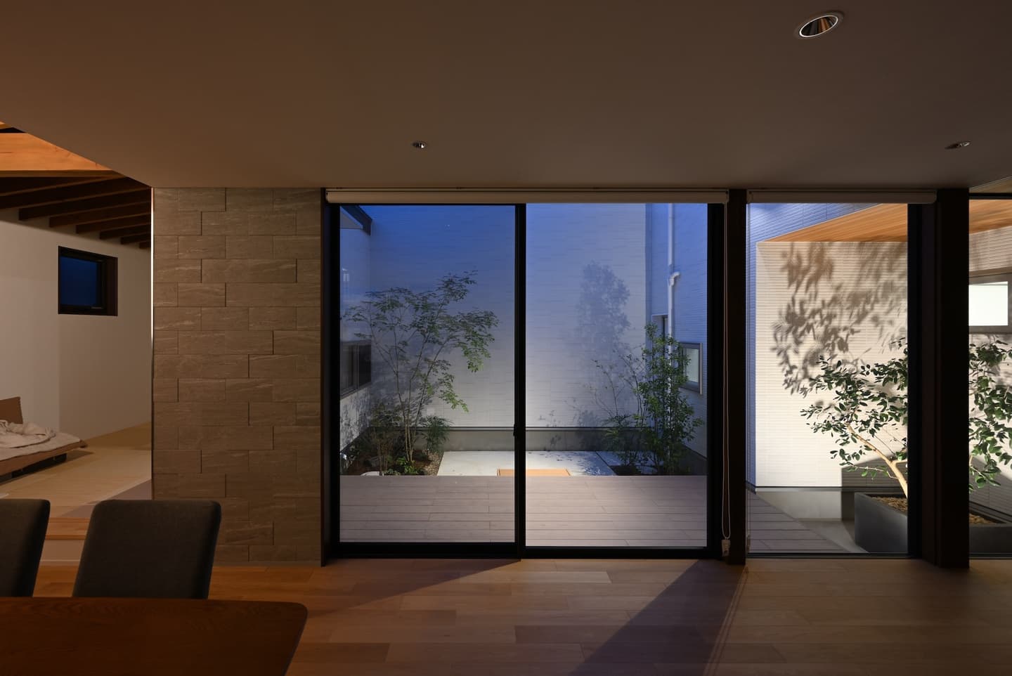 カーテンに頼らずのびのびと過ごせることも、この住まいの大きな魅力です。中庭を囲むように配置された各室は、どこにいても自然を感じられる心地よさを持ち、日々の暮らしにゆとりと楽しさをもたらしています。