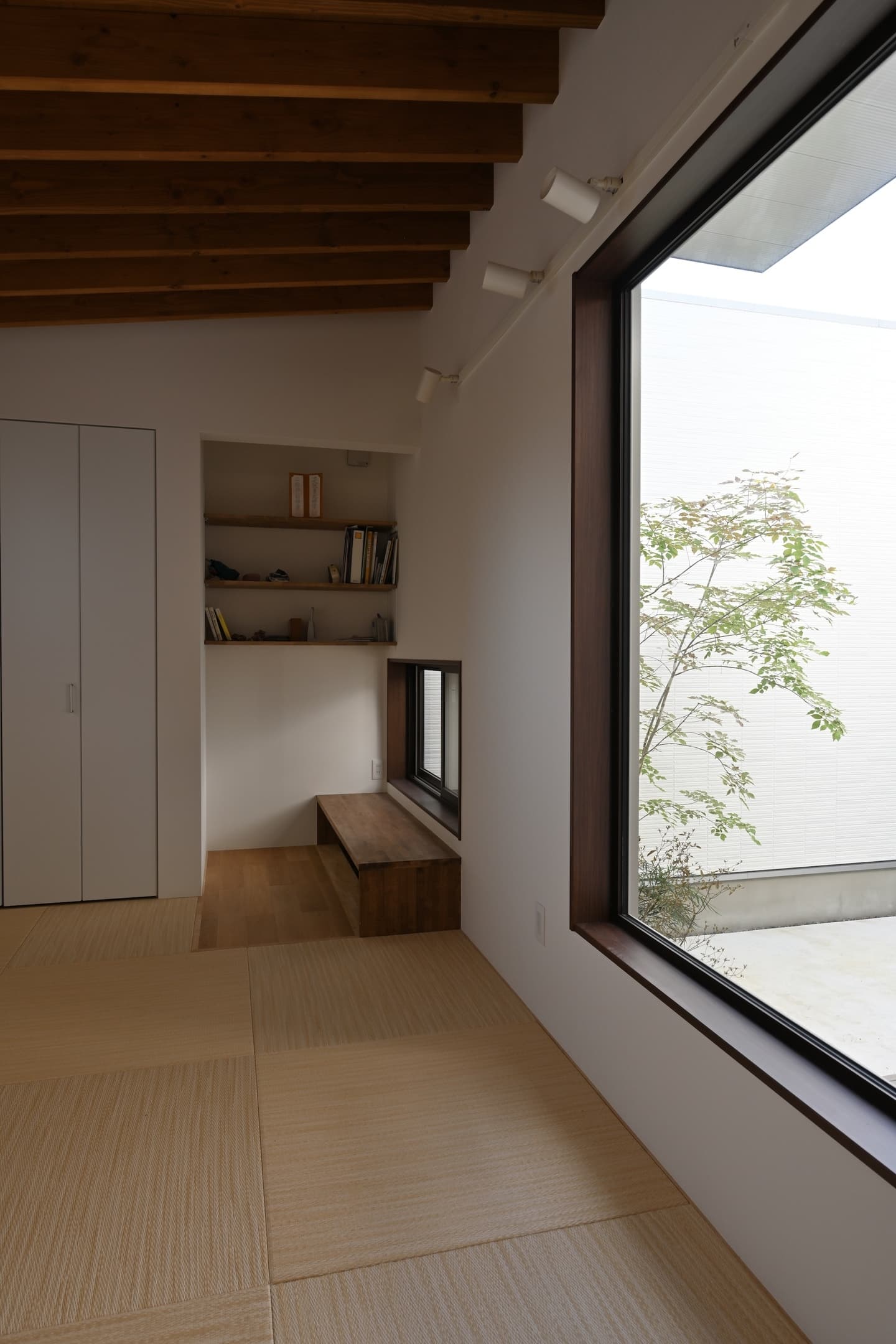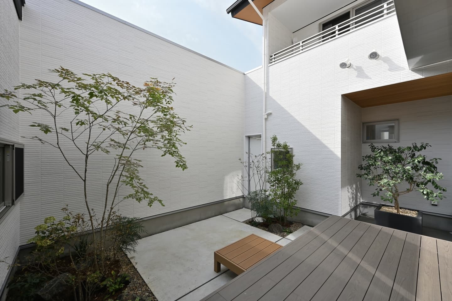 中庭を玄関まで延長させ、入ると正面に緑が見えて季節感を感じられるようになっています。それ以外、部屋の様子などは玄関からは見えないような間取りになっています。