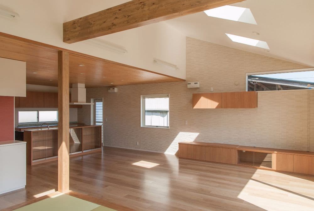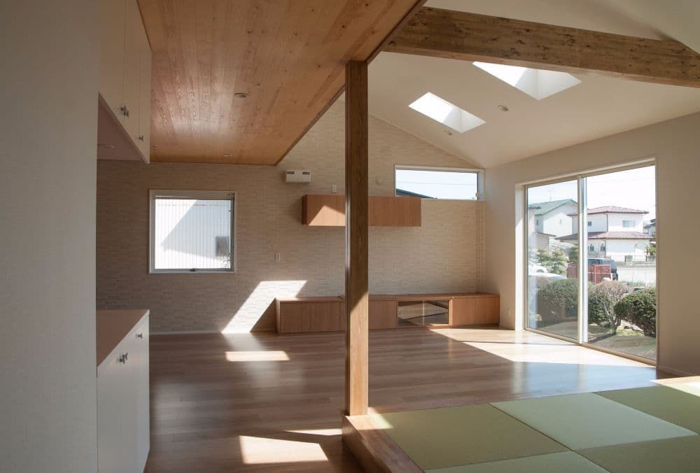 住宅の基本的な機能である玄関やLDK、サニタリーを共有する最大のメリットは、単に無駄がないというだけでなく動線が単純で将来の家族構成の変化にも柔軟に対応出来るところにあります。本計画は二世帯で5LDKとなっていますが、いずれは子供たちも所帯を持って三世帯となることも想定し、ひとつひとつに余裕を持たせた計画となっています。また、来客も多いので1階のLDK+タタミコーナーは36.5帖となっています。