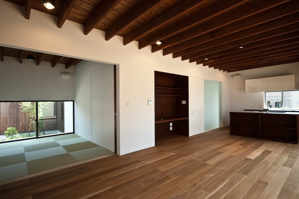 東西南北全てに窓を設けたリビングからは、爽やかな風とともに、四季折々の庭木を楽しむことが出来ます。仕上材や造作家具の素材にもこだわり、上質な空気感を追求しています。