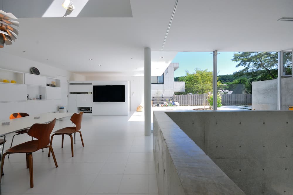 第2のリビングとでも言うべきゲストルームは、半地下部分に埋め込まれており、連続する外部空間も同様に半地下に掘り下げることで、溢れる緑以外余計なものは一切排除された、非日常的な空間となっています。