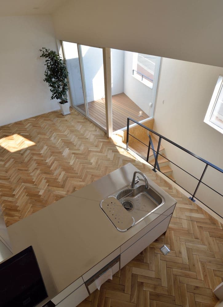 くさび形の変形狭小敷地に建つ、延べ床約30坪の狭小住宅です。