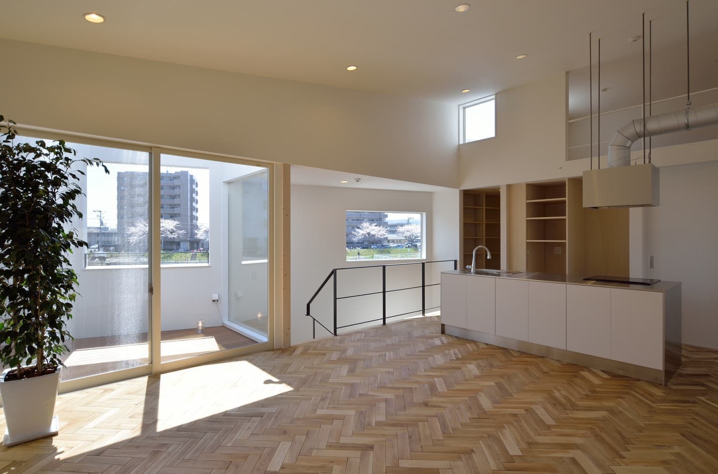大きな幹線道路に面するため、外部との関係を考慮しながら適切な「間」を取ることで開放的な住空間を実現しました。