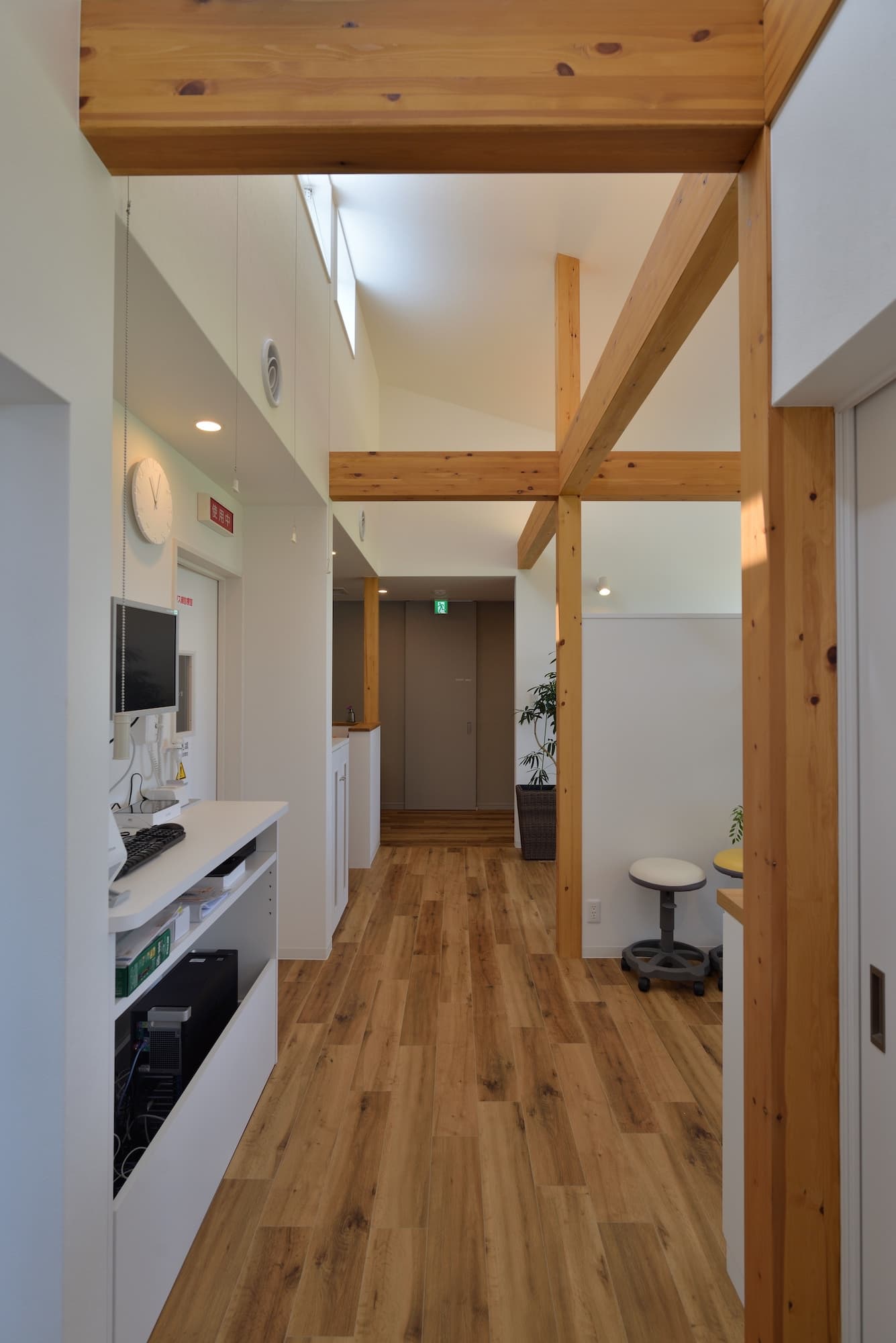 人口約6,500人の浅川町の外れにあるこのクリニックを公民館のような場にしたいという院長の想いから、治療だけでなくもっと気軽に立ち寄れる明るい雰囲気で待合と診療がオープンに繋がった計画としました。