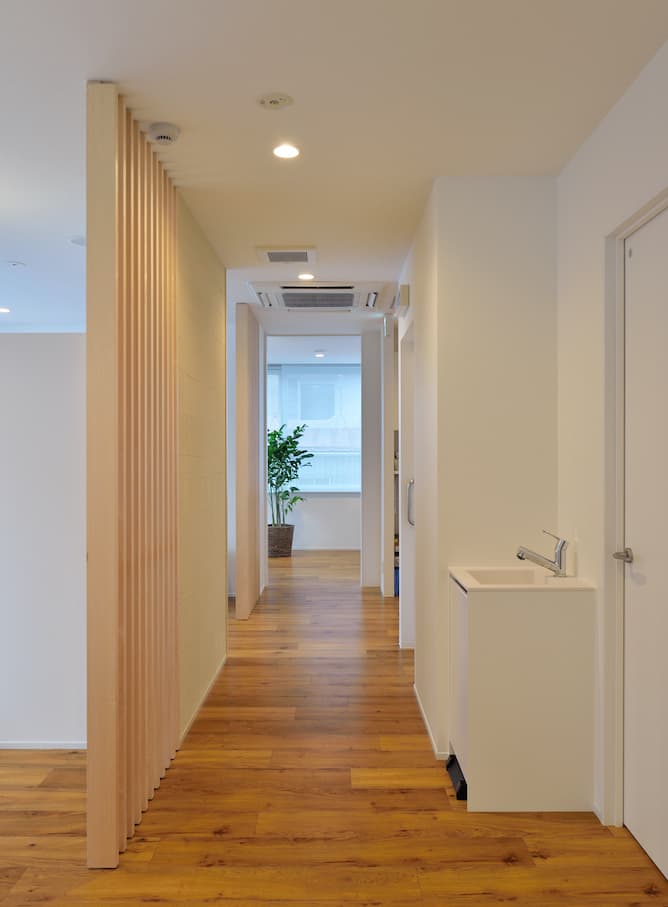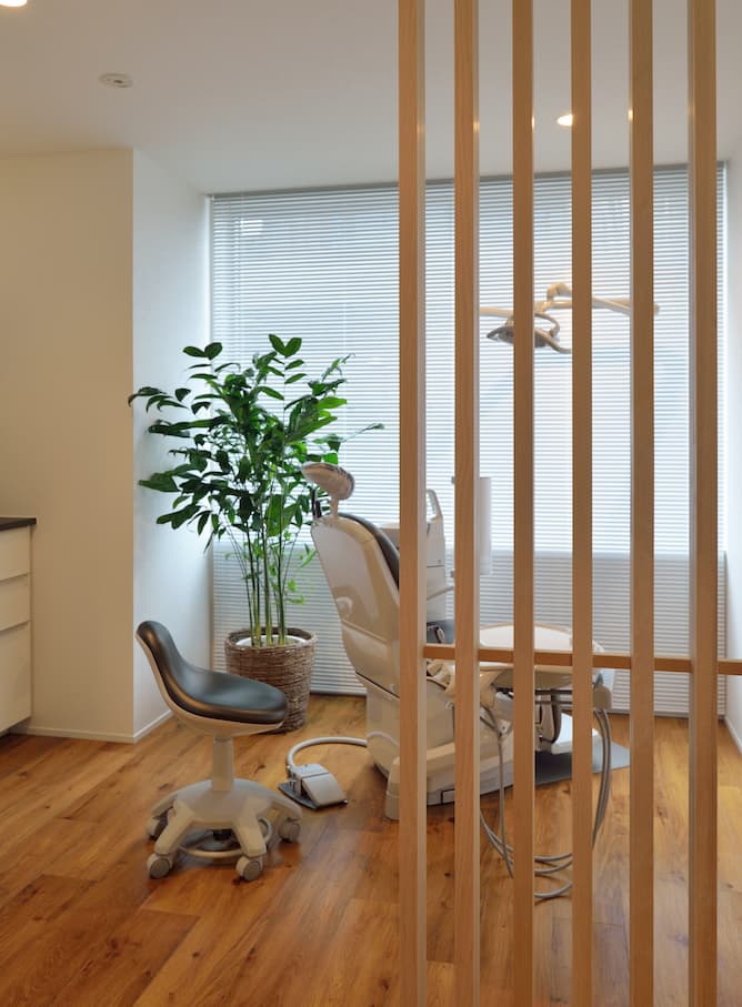 この医院の居心地の良さは空間の大きさだけでなく、木目が活きる内部の雰囲気によってももたらされます。歯科医院が、治療のみに訪れるものではなくもっと身近な存在になれば、予防の普及にもつながると考えてデザインしました。