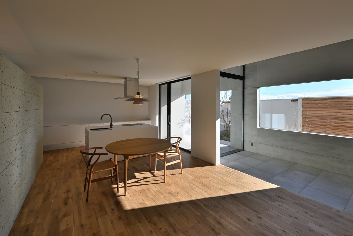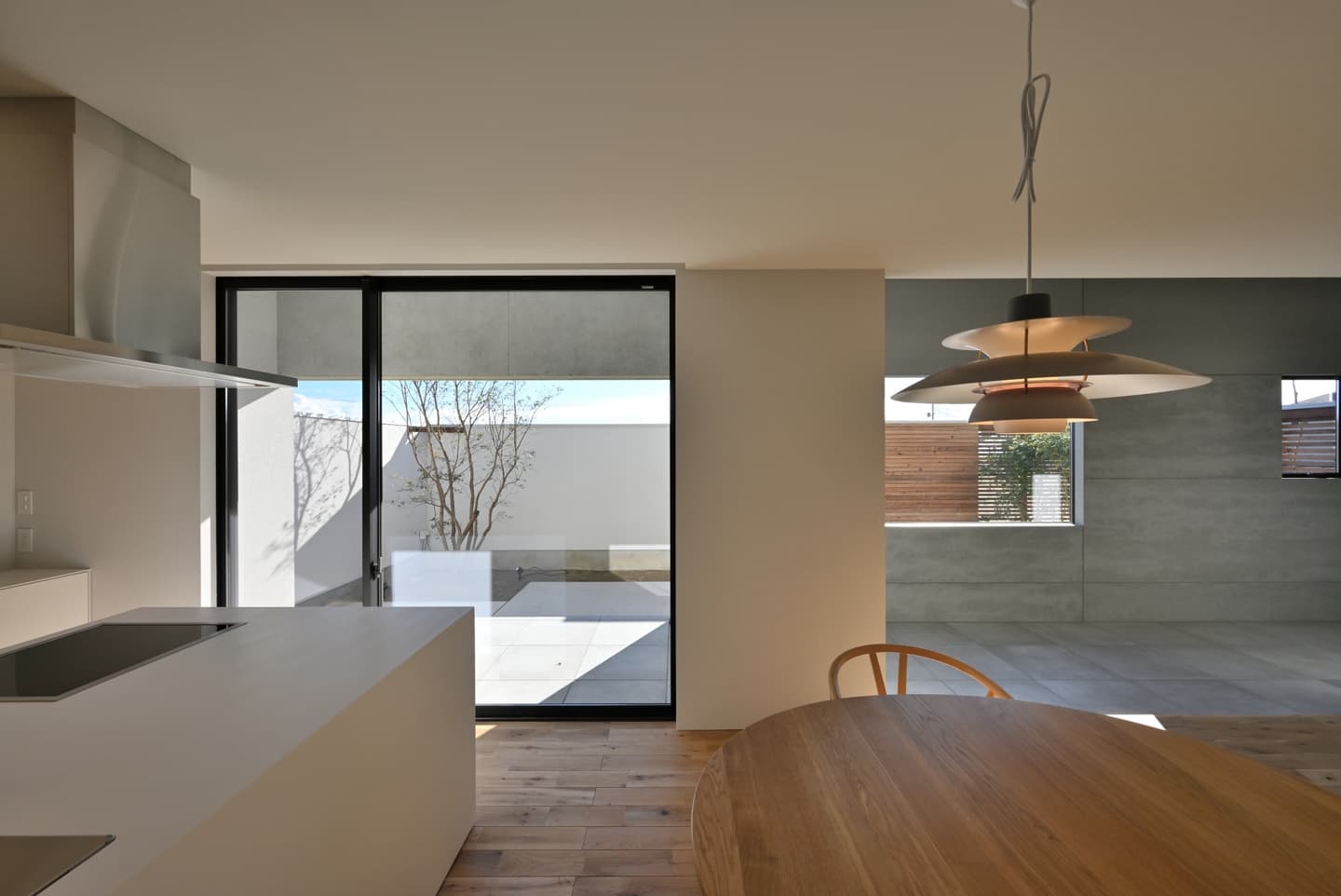 本計画は、外と内の関係性を層ごとに変化させて様々なシーンに柔軟に対応できる平屋住宅で、土間やテラスの層を庭とLDKの間に挿入して緩衝帯とすることで、季節や時間帯に応じて生活の重心を移せるようになっています。