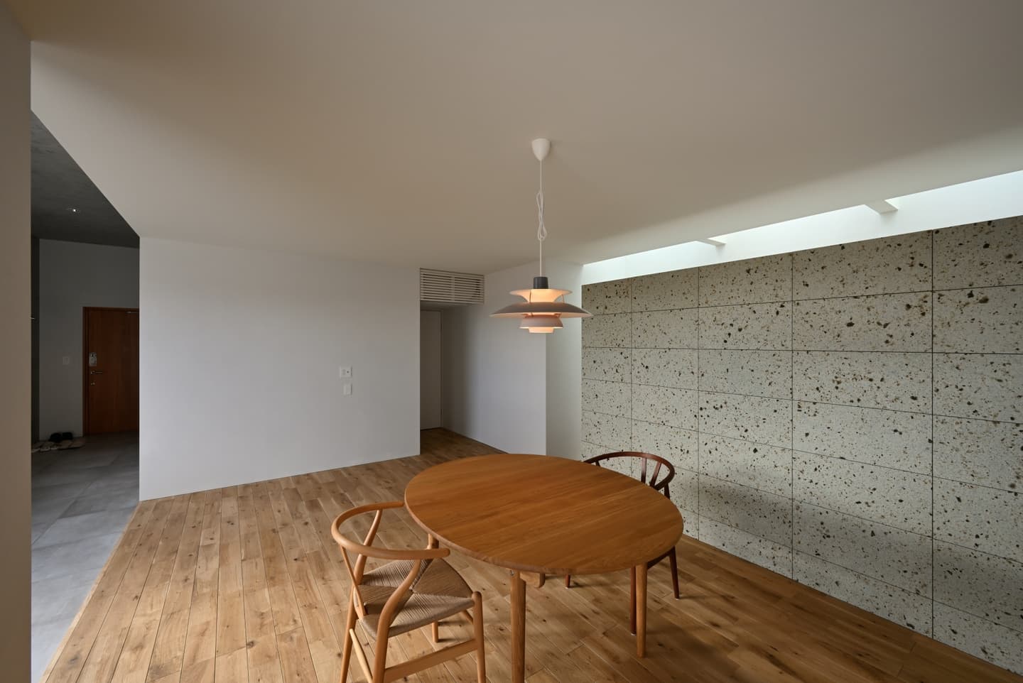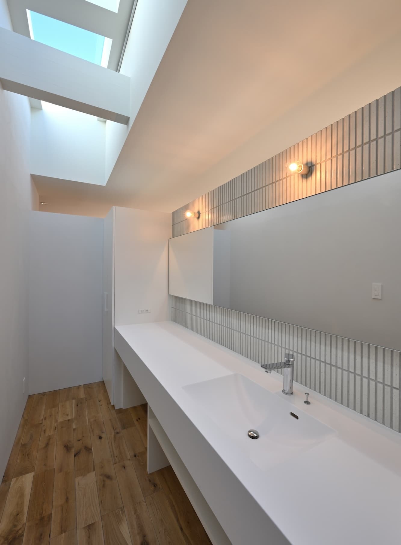 また、その奥には天窓から空が見える洗面コーナー、一番奥に寝室を配置し、徐々にプライバシー度が高くなっていき、家事動線と生活動線の効率化を図りつつ、プライバシーと開放性を両立させた住まいとなっています。