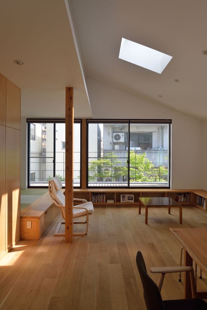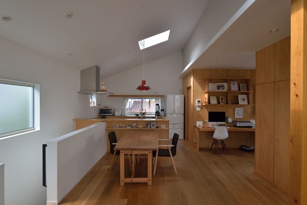 リビングは採光を確保するため2階に配置し、高い天井とトップライトにより明るく開放的な空間になっています。