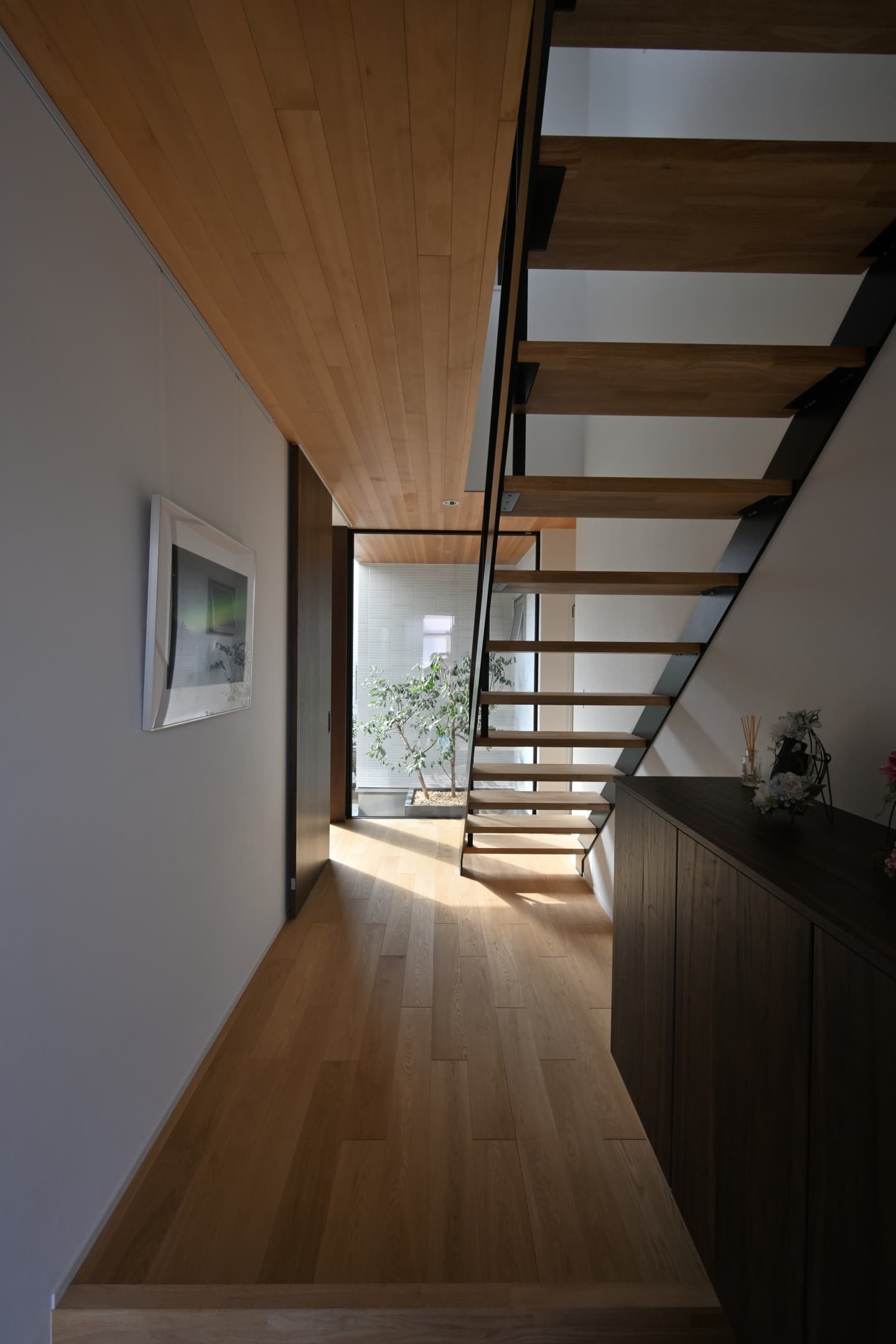 中庭を玄関まで延長させ、入ると正面に緑が見えて季節感を感じられるようになっています。それ以外、部屋の様子などは玄関からは見えないような間取りになっています。